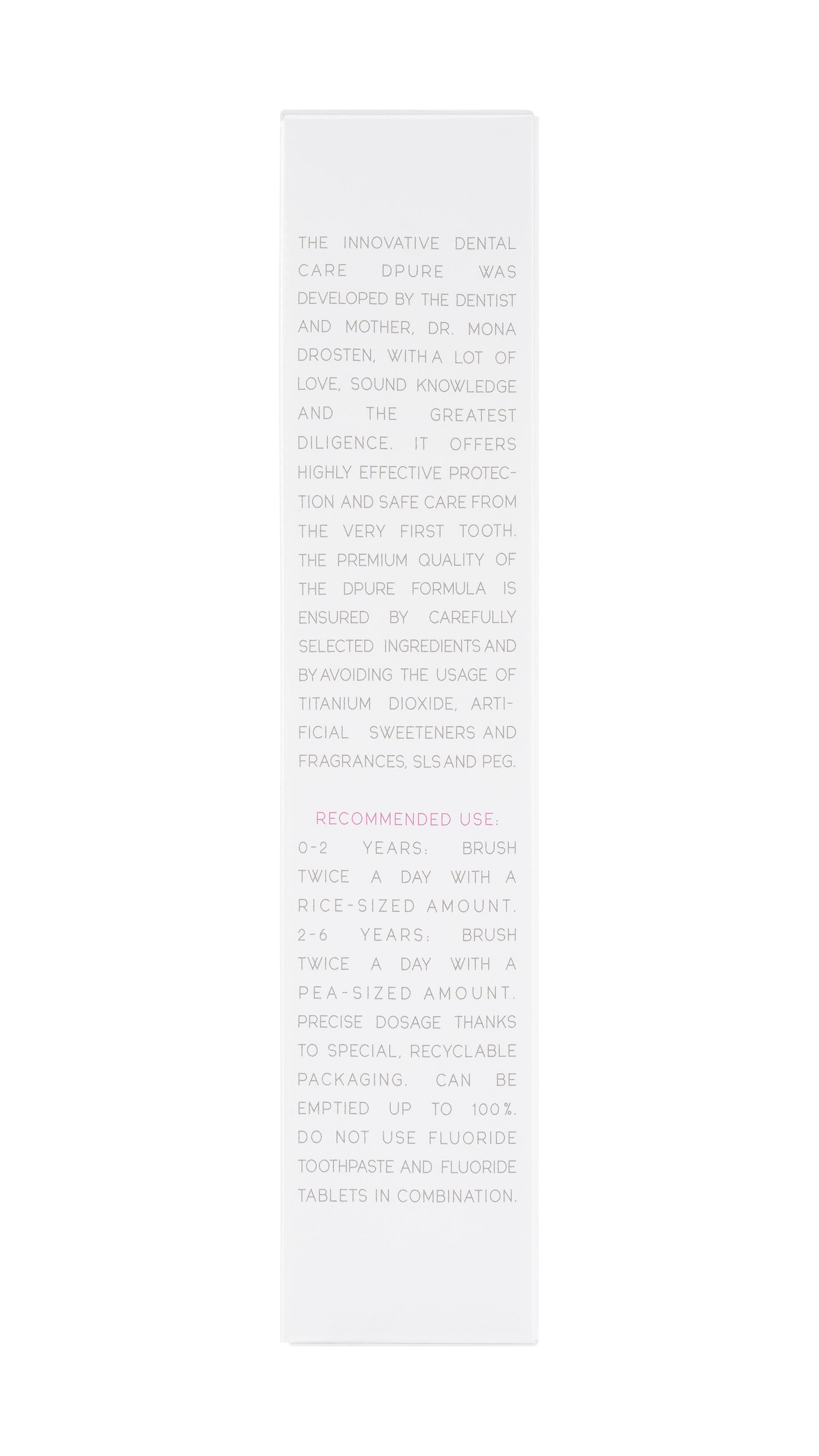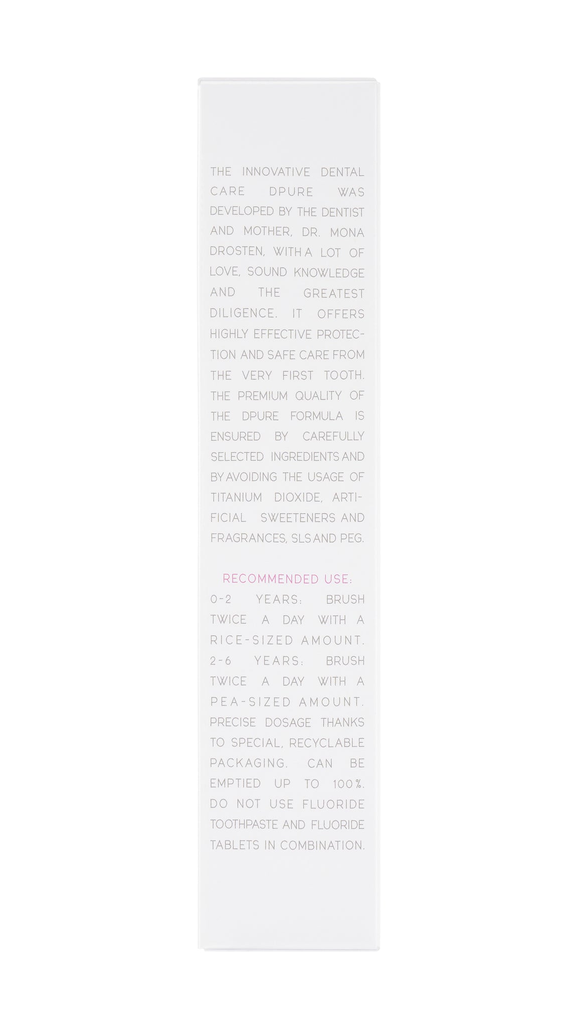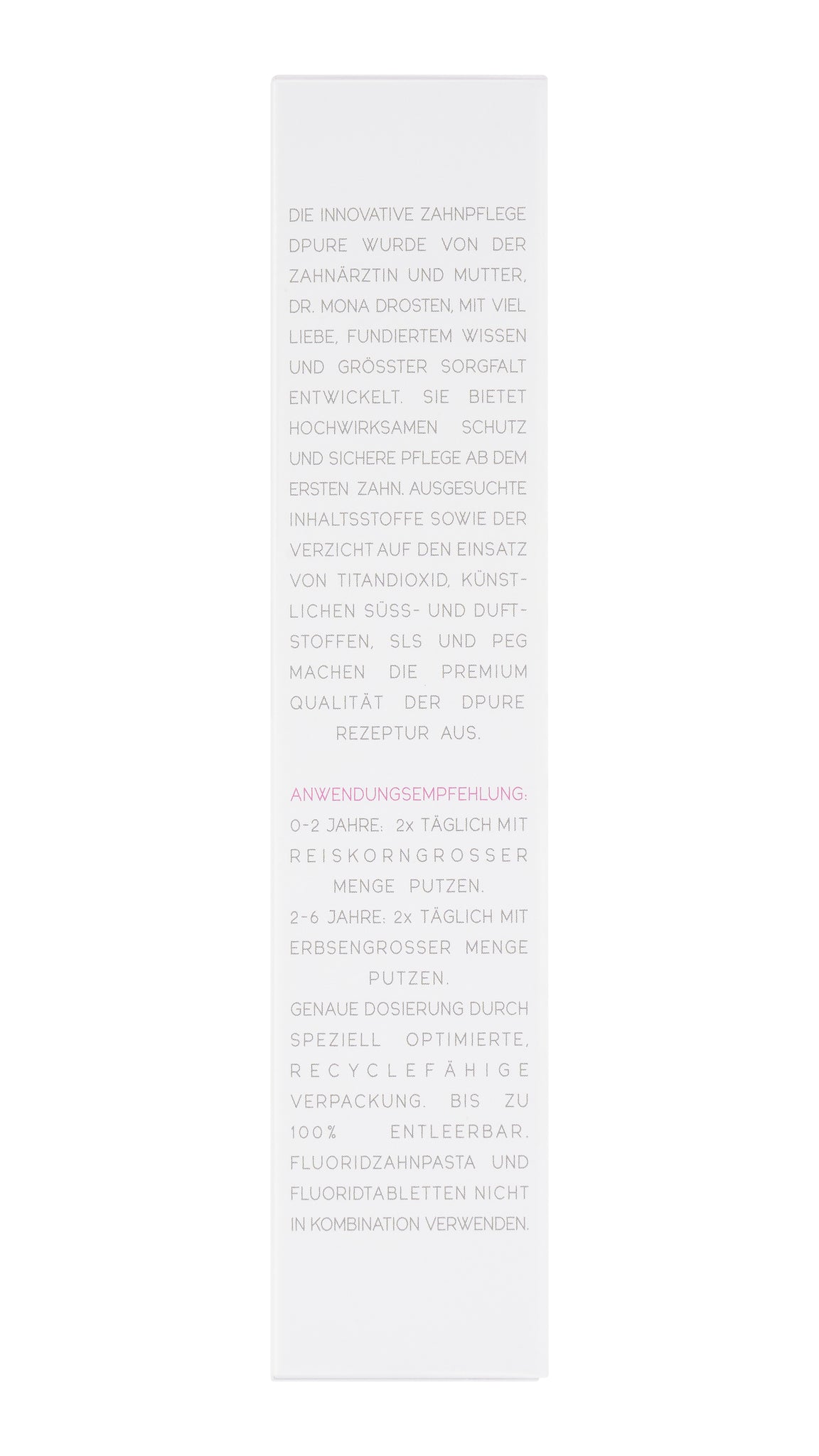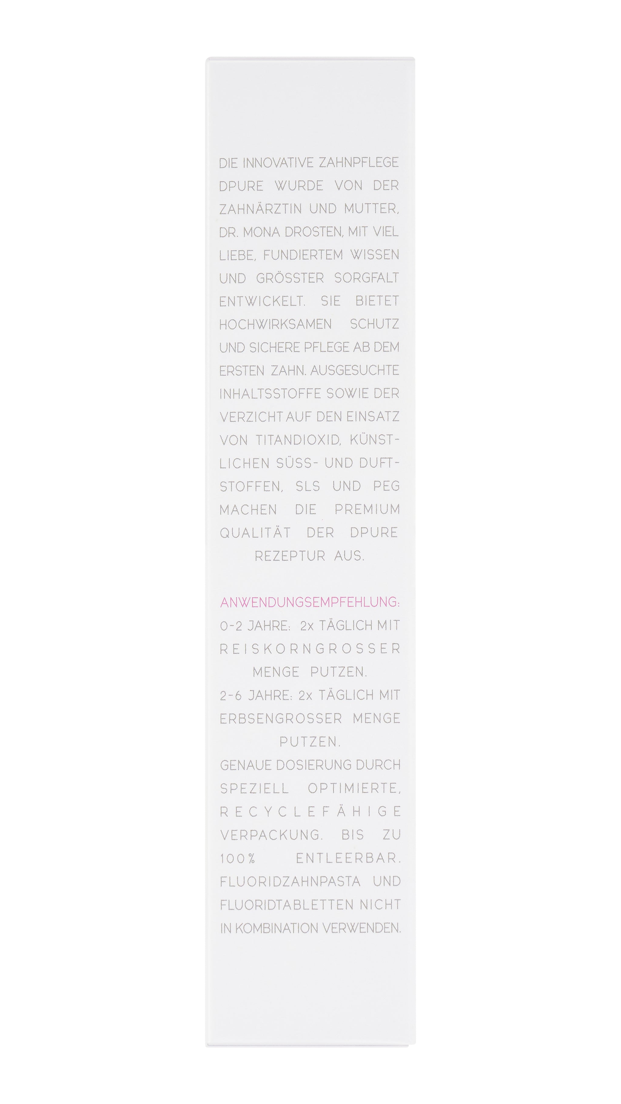 DIE INNOVATIVE ZAHNPFLEGE dpure WURDE VON DER ZAHNÄRZTIN UND MUTTER, DR. MONA DROSTEN, MIT VIEL LIEBE, FUNDIERTEM WISSEN UND GRÖßTER SORGFALT ENTWICKELT. SIE BIETET HOCHWIRKSAMEN SCHUTZ UND SICHERE PFLEGE AB DEM ERSTEN ZAHN. AUSGESUCHTE INHALTSSTOFFE, SOWIE DER VERZICHT AUF DEN EINSATZ VON TITANDIOXID, KÜNSTLICHEN SÜß- UND DUFTSTOFFEN, SLS UND PEG MACHEN DIE PREMIUM QUALITÄT DER dpure REZEPTUR AUS.